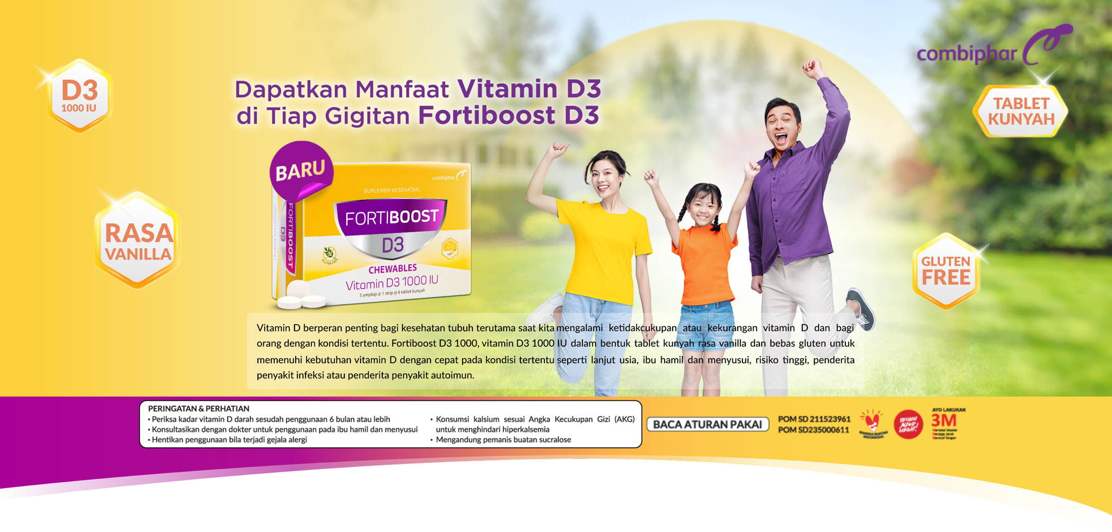 Fortiboost tablet kunyah Vitamin D3 1000 IU rasa vanilla yang dapat membantu penyerapan kalsium dan fosfor untuk kesehatan tulang dan menjaga daya tahan tubuh.